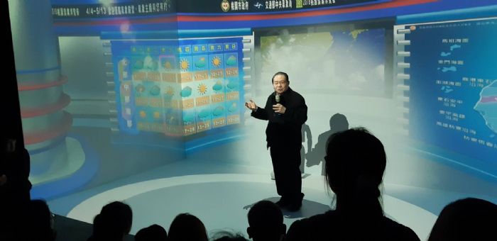 而進到展區內,迎賓意象裝置也很“氣象”,利用高速水閥開合演出各種水舞秀,同時結合桃園各區預報資訊,讓民眾在欣賞優雅的水舞表演時,也能獲取氣象資訊。而另一頭的「萬象劇場」,民眾一進入展場的第一個反應:「哇!螢幕好大。」就像踏進電影院一般,以特製的5比1超寬幅螢幕為大家帶來一場視覺饗宴,展覽期間播映內容包含浪高體驗、地震強度、擬衛星介紹…等。