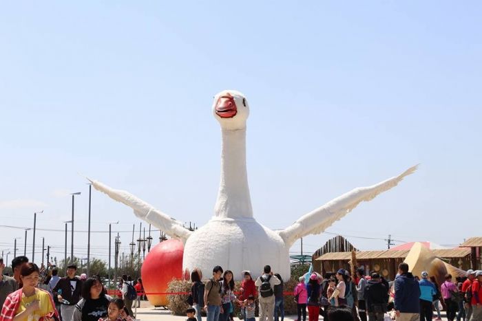 去年桃園農博邀請了六藝劇團和台灣戲曲學院,量身訂做全新大型歌舞劇備受好評,今年再接再厲,由紙風車劇團接棒,特地為農博打造高約10米、寬14米的「鵝媽媽花車」,不僅會眨眼,還能張開雙翅,表情生動的鵝媽媽,後頭緊跟著在地元素,甘藷、花生、水蜜桃、錦鯉…等大型玩偶。