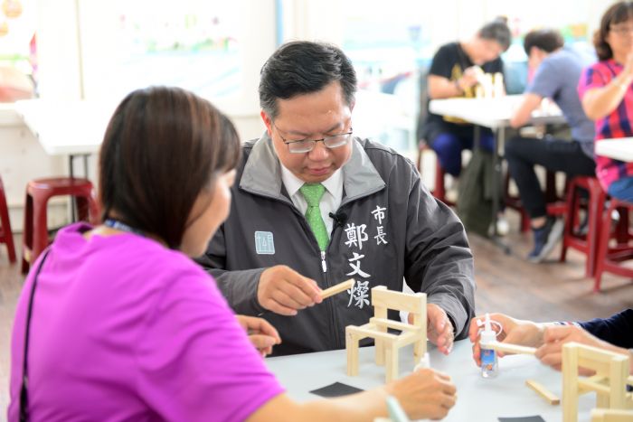桃園市環保局邀請大家體認資源再生與循環經濟的重要,於農業博覽會設立「環保再生館」,展示許多由資源回收物重製而成的家具及藝品。桃園市長鄭文燦13日上午赴場館,與大小朋友們一起將一根根廢木條組裝為手機架,讓廢料重獲新生。