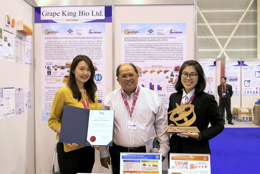 葡萄王專利常勝軍,猴頭菇菌絲體發酵技術屢獲中國、韓國、美國、德國等國際獎項肯定,在前期研究已證實能降低疼痛、預防神經退化性疾病。本次參展進一步擴展至全球老年化議題,動物實驗證實服用猴頭菇菌絲體能有效降低對低頻及中頻聲音的感受閾値(即聽得到聲音所需的最低分貝),可預防或改善老年性聽力退化。本次的預防聽力退化應用專利加上過去在失智症預防的研究,更擴大了長青保健市場,改善銀髮族社交,大幅提升生活品質,因此獲得到大會金牌獎及馬來西亞特別獎肯定,並在今年也取得美國FDA 的新膳食原料編號(New dietary ingredient,NDI No.1052)。