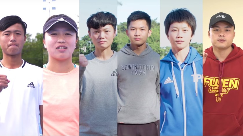 世大運選手參與107全大運十分踴躍,並有六位選手協助 拍攝宣傳影片,左起男子網球李冠毅、女子網球李亞軒、跆拳道莊佳 佳、撞球許睿安、滑輪溜冰楊合貞和男子標槍鄭兆村。(全大運承辦中央大學提供)