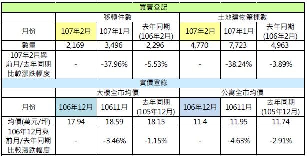 根據本市買賣移轉登記案件統計,107年2月買賣登記案件量 共計2,169件,與上月(3,496件)相較減少約37.96%(1,327件);與去年同期(106年2月)相比,則減少約5.53%(127件)。此外,在107年2月土地、建物買賣移轉登記之筆、棟數方面,土地為2,839筆、建物為1,931棟,共計4,770筆,較上月(7,723筆)減少38.24%(2,953筆),與去年同期(106年2月)相較減少3.89%(193筆)。整體而言,107年2月適逢農曆春節連假且因工作天數較少,受季節性因素影響,為一年中交易件數最少的一個月,惟交易量仍與去年同期相去不遠。
