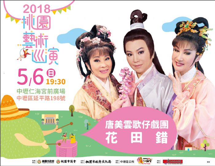 「2018桃園藝術巡演」第1場-中壢區戶外演出,將由精緻傳統戲曲的唐美雲歌仔戲團,於5月6日(日)晚間7時30分在中壢區仁海宮廟前廣場為中壢區市民帶來作品《花田錯》。