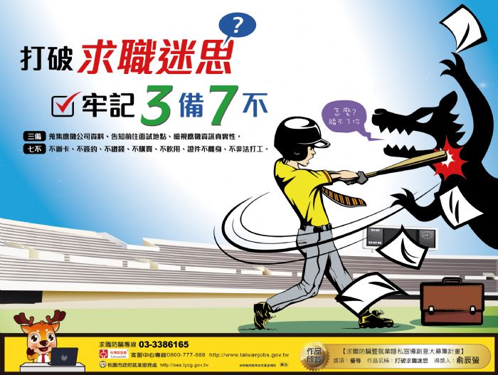 今年度就業服務處將「求職防騙暨就業隱私宣導創意大募集-漫畫及海報設計競賽」得獎作品作為宣導主視覺設計,打破以往宣傳方式,改以生動活潑的海報及漫畫來加強民眾印象,達到宣導目的。