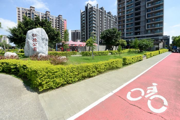 八德區仁德公園將增設天幕並更新溜冰場、兒童遊戲專區、自行車道。過去兒童遊戲區多為罐頭式的塑膠遊樂器材,未來更新將以老少、身障共融式遊具為主。水務局目前也針對八德重劃區整體水圳及步道系統進行規劃,未來都會以自行車道連結。