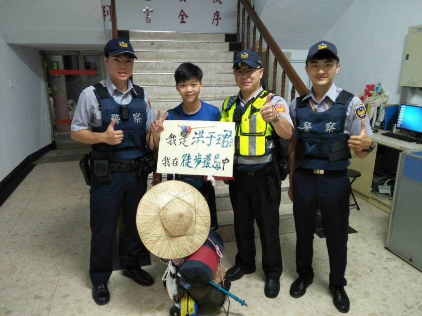 楊梅分局楊梅派出所長林祺笙、警員林泰宇於7月16日21時執行金融巡守勤務,巡簽楊梅火車站前超商,見一名女生在超商內閱讀書籍,身邊行囊很多,員警以為其是離家出走,細問之下,得知85年次洪女大生正在進行徒步環島旅行,便協助高雄餐旅大學西餐系的洪姓女大學生完成徒步環島夢想。
