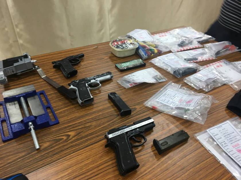 桃園市政府警察局楊梅分局與保安警察第三總隊第一大隊依據情資,於7月16日19時許在桃園市楊梅區裕成○路*號*樓之*,查獲黃○洺(男,76年次,籍設新北市汐止區)妨害自由通緝犯,專案員警緝獲黃嫌後,並在屋內觸手可即處發現改造槍枝2把〈初篩有殺傷力〉、子彈2顆、手指虎1付、二級毒品安非他命9.7公克及其吸食器與鑽床等改造槍枝工具一批,另搜索扣得偽造刑警證及警友站顧問背心。