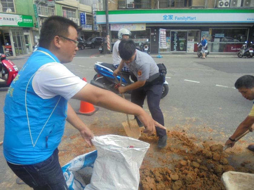 警員林建兌為了維護人車安全,頂著炙熱的艷陽下,在道路上排除散落的泥土及石塊等障礙及實施交通管制,將路上土石剷除且恢復交通安全與順暢,過程中因天氣炎熱,員警汗流浹背,讓在附近民眾及經過的路人,直呼警察工作除了維護地方治安與交通外,為了避免民眾生命財產遭受損害,還在炎熱高溫下清運道路上障礙物,實在很辛苦!
