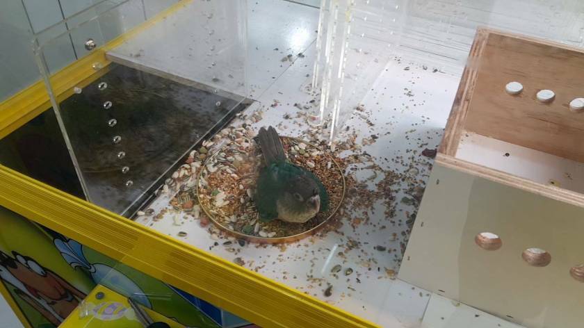 龜山派出所24日23時40分接獲民眾報案中興路某夾娃娃機台內有一隻鸚鵡,員警到場處理,當時檢視機台內無插電,而鸚鵡周邊有水、有飼料,通知機台呂先生(22歲)到場,呂先生表示,鸚鵡於24日18時許飛來店裡停在他的肩膀上提不離開,看見因它非常漂亮,又找不到主人想飼養它,臨時找不到籠子,把機台內物品移開,關掉電源,將鳥暫時安置在裡面,員警將人鳥帶回派出所處理。