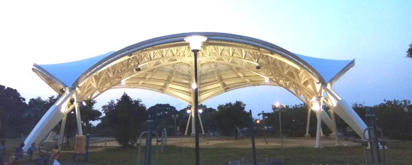 楊梅區姚敦明區長表示,市府上任後推動公園設施活化政策,在各地區增設天幕球場及天幕活動場,獲得市民好評,四個天幕公園,「埔心公園」、「三民公園」、「高山天幕」皆已完工啟用,而壓軸的「伯公岡天幕」,8月4日也即將完工啟用,特別以梅花為設計主軸,天幕高度12.95公尺,面積1,105平方公尺,工程經費約2,100萬元,可容納800人在此活動,不僅提升公園在雨天及夜間的使用率,平時也提供遮陽功效。