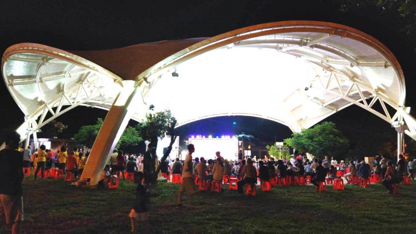 楊梅3大2小天幕工程,面積最大且造型最特別的伯公岡公園天幕8月4日完工啟用!楊梅區公所規劃了「星光閃耀 音樂飄揚」2018楊梅天幕公園啟用音樂會系列活動-客家本色之夜在伯公岡天幕下舉辦,希望能讓民眾感受天幕所帶來的便捷。鄭市長致詞表示,楊梅伯公岡天幕啟用音樂會,市民熱情的參與,代表對建設的期待。楊梅建設快速,4年內已核定投資超過100億元,市府會繼續往前衝、往前走,讓楊梅發展更好。