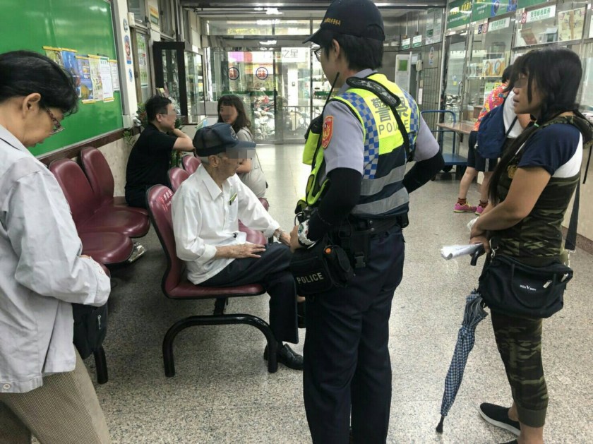 楊梅分局草湳派出所巡佐陳水松、警員葉欣梅2人,21日10-12時巡邏勤務,於11時20分獲報楊梅區中興路埔心郵局稱急需協助,員警立即驅車趕往,抵達後見一名年約90幾歲秦姓老翁帶著照顧他的外傭(譯名娃蒂),在內對行員大聲斥責,經行員指稱老翁未備有帳戶印章,卻又急著要提領戶內10萬元,詢問又説不出要做何用途,其外傭剛來不久,許多言語不甚清楚,遂報案請警方協助。