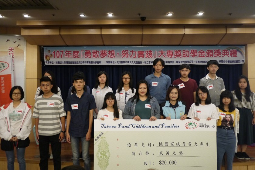 桃園家扶中心假107年9月1日於中壢天晟醫院國際會議廳舉辦107年度大專獎助學金頒獎典禮,本次活動由私立李紹陽文理語文短期補習班、磐采股份有限公司、京懋建設一同贊助經費,天成醫療社團法人天晟醫院及桃園市中壢區新街國民小學無償租借活動場地,而本屆共有169位學生獲頒大專獎助學金,博士班學生1位、研究所學生15位、今年剛考上大學的新鮮人36位,獎學金共計發放3,380,000元。獎助學金頒獎典禮特別邀請到京懋建設執行長─范秉豐,以自身成長奮鬥故事鼓勵弱勢家庭學生面對任何考驗,努力往夢想邁進。