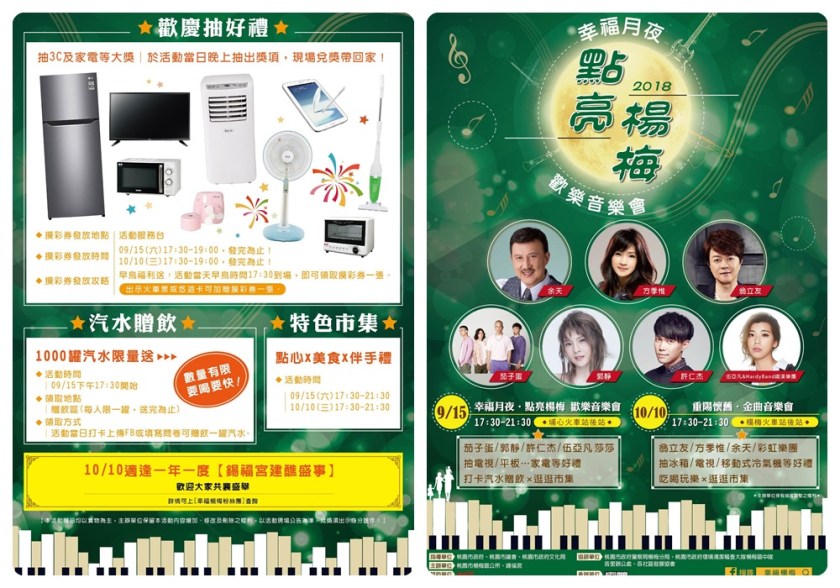 楊梅區公所9月15日在埔心火車站後站舉辦「2018幸福月夜.點亮楊梅 歡樂音樂會」,邀請到重量級的卡司現場演唱,主辦單位現場提供抽獎券也規劃有楊梅特色市集,讓民眾除了享受音樂、美食,還有機會抱走大獎!