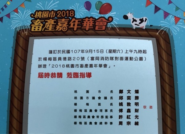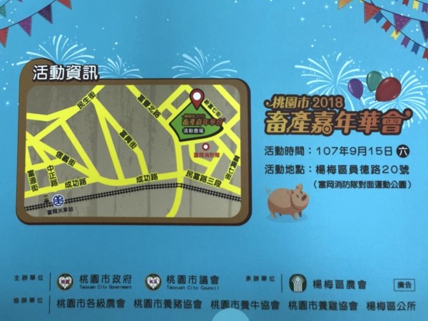 2018桃園地景藝術節將於9月14至30日於富岡熱鬧登場,此活動為富岡地區有史以來最大規模活動。楊梅區農會為了展現在地農業特色,亦由桃園市政府農業局委託於9月15日在富岡消防隊前廣場辦理「畜產嘉年華活動」,有客家米食品嚐、烤大豬、美食攤位、親子DIY、闖關遊戲等等,邀請您全家一起來熱鬧一番喔!