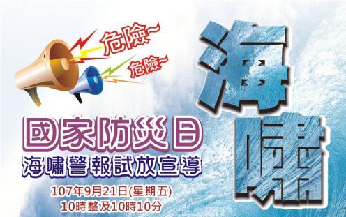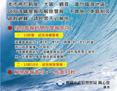 桃園市將於新屋、大園、觀音、蘆竹臨海地區,試放海嘯警報及解除警報,不實施人車管制及疏散避難,請民眾不必驚慌,發放警報時間及警報音符如下: