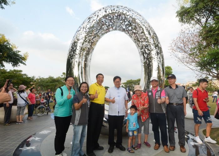 每個地方的環境藝術都有其特色,像是今日活動所在地的《健康之環》以不銹鋼製作,上面具有跑步、足球、直排輪、棒球以及親子遊戲、休閒活動的圖騰。《等待而憩.滿袋而歸》則為5座石雕作品,外型像是的放著、束著、綁著的麻布袋,能夠坐臥、攀爬及觸摸。包括桃園市議員李家興、市府副秘書長邱俊銘、文化局長邱莊秀美、楊梅區公所主秘李秀玉、楊梅副分局長楊昌祐均一同出席活動。