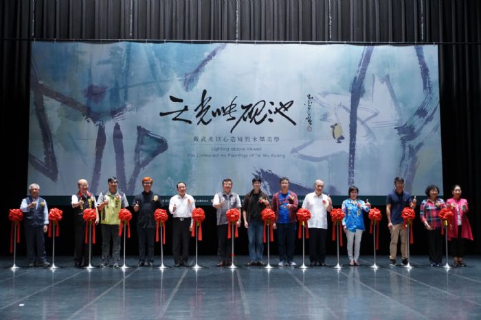 桃園市政府客家事務局29日於客家文化館舉辦「天光映硯池-戴武光以心造境的水墨美學」客籍藝術家邀請展開幕茶會,由客家事務局長何明光與水墨等藝文界貴賓舉行剪綵儀式。
