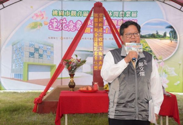 桃園市長鄭文燦4日下午前往觀音區,出席「桃園市觀音區蓮花園休閒農業區蓮花意象休憩空間興建工程開工動土典禮」,鄭市長表示,目前桃園通過核定的休閒農業區已達8個,休閒農場也有66家,其中,觀音蓮花園休閒農業區為第一個通過的休閒農業區,帶動蓮花產業熱潮,也讓觀光人口不斷增加,因此將進行大地工程、基礎工程、景觀工程,未來將具備導覽中心、活動舞台、埤塘公園、停車場。工程總經費3,128萬元,明(108)年過年前完工,未來可提供舉辦活動及導覽功能,期盼能夠展現農業魅力及農村社區的不同風情。