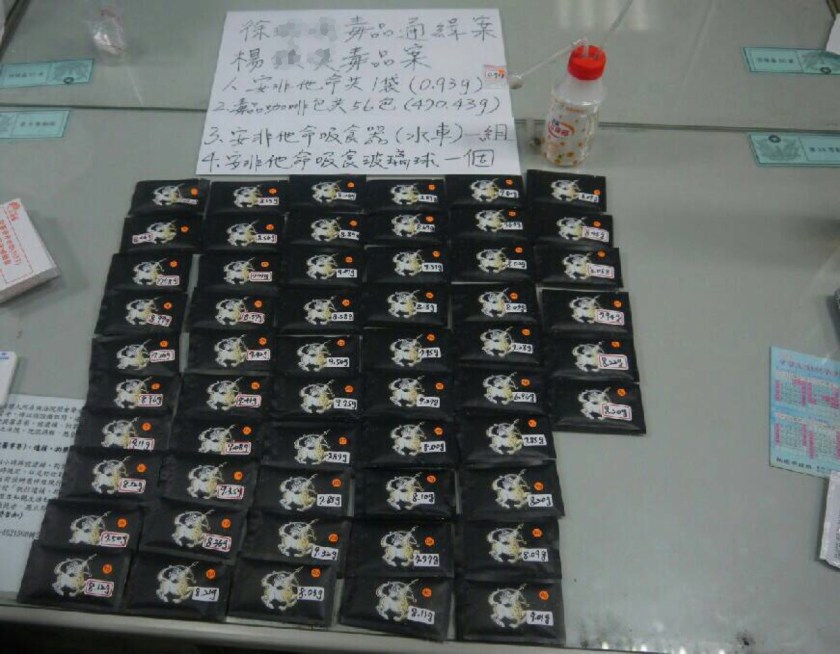 楊梅分局草湳派出所員警10月4日19時許,循線在桃園市中壢區查獲一名毒品通緝犯,又在徐姓(28歲)通緝犯家中發現一名男子楊0漢(36歲)身上發現安非1袋(含袋重0.93g)、安非他命吸食器水車、玻璃球各一組;後搜索屋內再行查獲人頭馬圖樣毒品咖啡包56包,56包含袋共重470.43g。
