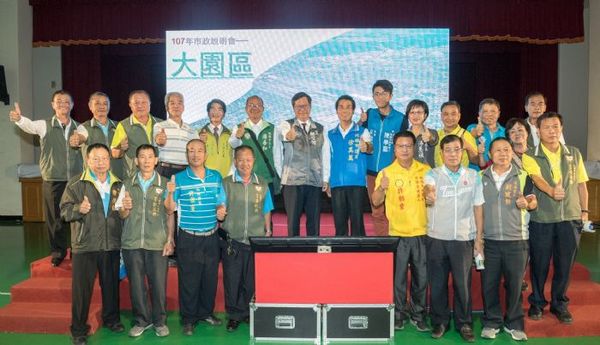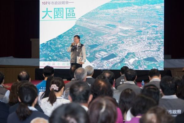桃園市長鄭文燦7日下午前往大園老人文康綜合活動中心,出席「桃園市大園區市政說明會」,鄭市長表示,目前大園區人口9萬人,正在改變與進步,深具發展潛力。在推動桃園航空城計畫的同時,也推展大園區各項建設,同時亦兼顧舊大園的發展,融合新、舊大園,期盼透過各項交通、教育、文化、社福、體育等建設逐項開工、完成,讓大園區脫胎換骨,使居民享受更好的建設與福利。