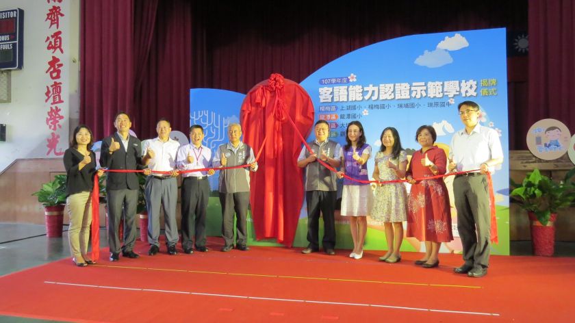 為鼓勵國民中小學重視客家語言文化發展保存,桃園市於107學年度成立7所客語能力認證示範學校,9日假楊梅國小舉行揭牌儀式,由客家事務局長何明光、教育局長高安邦及楊梅區的上湖國小、楊梅國小、瑞埔國小、瑞原國中,龍潭區龍潭國小、新屋區大坡國小、觀音區觀音國小等7所示範學校校長等貴賓共同揭牌,宣示市府加強推動客語向下扎根的決心。