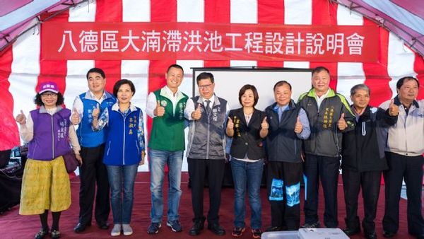 桃園市長鄭文燦11日上午前往八德區,出席「八德區大湳滯洪池工程設計說明會」時表示,市府辦理東門溪流域整治計畫,並爭取前瞻基礎建設計畫經費補助,其中大湳滯洪池工程,將於大湳水上樂園設置包括滯洪池、管理中心、停車場、水上生態廣場及環湖步道等設施,將提供約15萬立方公尺的滯洪空間,改善淹水、淤積問題。該工程總面積約5.6公頃,總經費約13億元,預計明(108)年動工,完工後不僅可改善周邊地區淹水問題,管理中心也可提供周邊居民使用。
