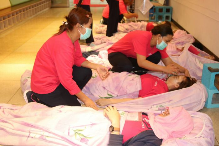 今日演練針對護理機構設計「三種不同起火點情境」現場由桃園市衛生局抽籤決定示範演練情境,不僅考驗示範機構防災演練的應變能力,也展現護理機構示範演練的真實性,另外,現場同步播放災害發生時機構災害示範演練的影片供現場觀摩的護理機構人員觀看。