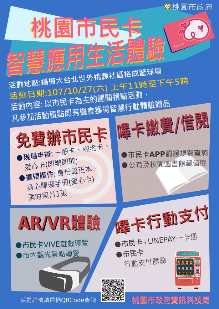 市府將於107年10月27日在楊梅大台北世外桃源社區裕成路籃球場舉辦市民卡智慧生活體驗日,匯集了市民卡智慧生活服務展示(如圖書借閱、規費繳納、門禁應用、小額消費支付)、整合性攤商行動支付試驗、AR/VR互動遊戲與新創科技產品之人機互動體驗,並以闖關活動方式吸引民眾一同參與。參與活動的民眾除了享受免費辦市民卡之福利、體驗市民卡的整合性創新服務,了解科技所帶來的便利。