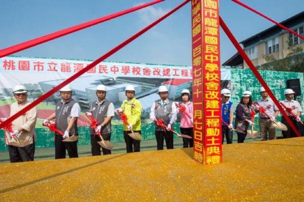 桃園市長鄭文燦7日上午前往龍潭區龍潭國中,出席「桃園市立龍潭國民中學校舍改建工程動土典禮」時表示,龍潭國中於民國50年創校,迄今已57年,早期校舍採分階段興建,致生新舊校舍介面不平整問題,並產生漏水及建物耐震強度不足等情形,亟待改善。桃園升格後,市府分別於104年12月及106年11月辦理視察,確立校舍改建方向,並決定採取「先建後拆」方式,減少對學校教學的影響。新校舍為地上4樓的建築,將設置18間專科教室,工程總經費約1億3,389萬元,預計於明(108)年10月竣工,提供師生更友善的教學環境。