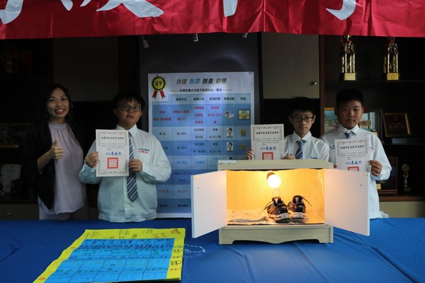 另一組優等作品是以「快速除濕、除臭鞋櫃」為構想,設計者是國一的莊博琛、莊凱博、李聿風,設計的發想是來自於在上學途中如果下大雨鞋子潮濕不易乾,因此希望能以最方便與簡單的方法,讓鞋子可以快速乾燥與殺菌,這個快乾除臭系統,可以裝置在家中現有的鞋櫃並且利用燈泡與咖啡包、茶葉包,達到快乾除臭的效果。在實驗過程中,同學們嘗試了各種類型各種瓦數的燈泡,最終證明使用250瓦的燈泡最穩定,且快乾效果最佳,若是採到水坑,鞋子全溼的情形下,也能在放入裝置後20分鐘內快乾。
