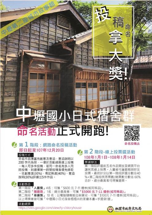 中壢第二座城市故事館「中壢國小日式宿舍」即將以嶄新面貌在108年5月開放。市府邀請市民集思廣益,關注桃園市文化資產空間活化再利用,彰顯文化地標與歷史印記。命名活動正式開跑,凡入圍者即有機會獲大獎。
