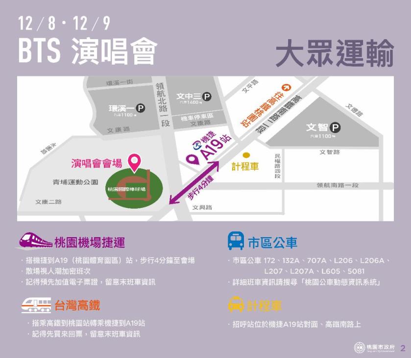 去年10月「防彈少年團」在林口體育館開唱,桃捷公司於A7體育大學站圓滿完成疏運工作,讓參加演唱會的粉絲們快樂出門,帶著愉快的心情回家。今年演唱會移師桃園國際棒球場,桃捷公司肩負疏運重任服務上萬粉絲,將於12月8日和12月9日晚間8點30分起,於原定班次區間加密班次,也將於A19站進行車站人潮動線管制,讓來自四面八方的海內外歌迷不論是要到機場搭飛機,還是搭客運、捷運回台北,抑或是搭高鐵回中南部,都能夠利用機場捷運轉乘,帶著美好心情平安回家。