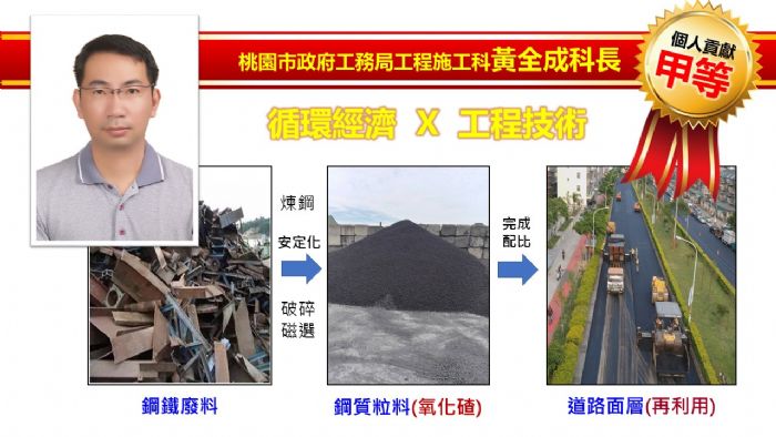 榮獲「個人貢獻獎第三類甲等-桃園市政府工務局工程施工科黃科長全成」可說是工程人員最高榮譽,黃科長積極推動研究,將鋼質粒料(氧化碴)做為道路面層材料使用及瀝青刨除料做為道路基層材料使用,並成功於八德區豐德路、石門大圳巡防道路進行試辦,使本府同仁及業界更具信心,遂陸續擴大應用於本市瓶頸道路打通闢建工程、道路年度歲修工程(包含工業區道路)、重劃區道路工程等,甚至導向於未來航空城工程之使用;解決產業難題-「點碴成金」再利用,達成資源永續利用之政策目標,俾利節能減碳。