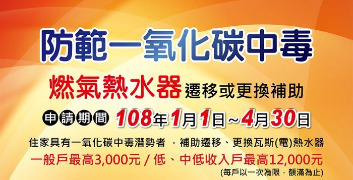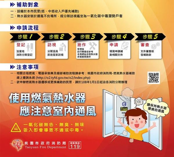 桃園市政府消防局為防範居家熱水器裝設不當造成一氧化碳中毒,例如屋外型熱水器安裝於室內或已加蓋、加裝氣密窗的陽台等情形,宣導民眾自明年1月1日起,可前往各消防分隊申請燃氣熱水器遷移或更換補助,經消防人員現地審視確認符合一氧化碳中毒潛勢場所條件者,申請者即可通知合格廠商施作,一戶以一次為限,並以「低收入戶、中低收入戶」為優先補助對象。