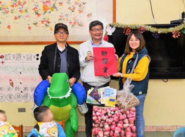 環保局長沈志修率梁開忠科長,齊赴「桃園市育德兒童之家」,和小朋友們提前跨年,一起享用披薩、蛋糕、烤雞及點心。梁科長更穿上逗趣的「恐龍裝」,與育幼院小朋友同樂,在寒冬中帶來溫暖歡樂的新年氣息。沈局長說:「在育幼院度過童年的孩子,更需要我們的眷顧及關懷。環保局向來行善不落人後,希望每位弱勢的孩子都能在愛中成長、茁壯,進而揮灑各自的天賦,展開精彩的人生。」
