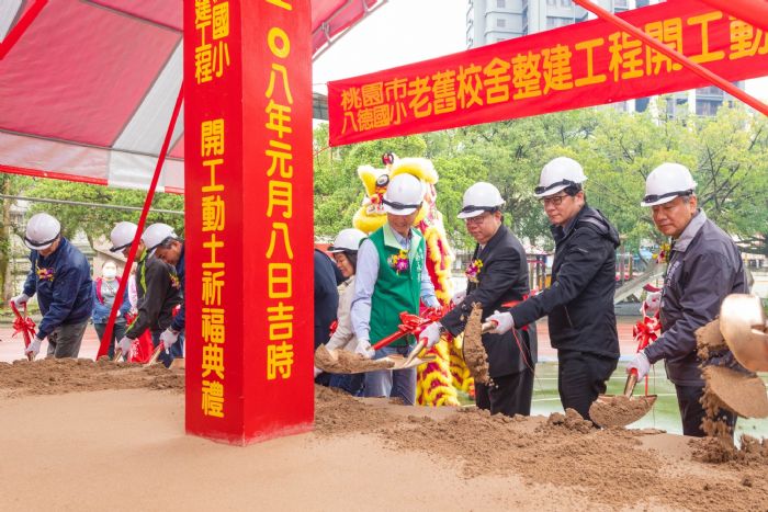 桃園市長鄭文燦8日上午前往八德區,出席「八德國小老舊校舍整建工程開工典禮」,鄭市長表示,八德國小設立於1899年,是桃園百年老校中最資深的學校之一,校園面積不大且學校建築物歷經多次整建,新舊雜陳,部分建築物耐震係數不足,因此市府決議以4.5億元經費協助八德國小更新,讓百年老校獲得新生命、展現新風華。新教學大樓預定109學年度正式啟用,市府將編列預算並向教育部爭取經費,擴充建築物內裝及硬體設備,持續改善教學空間。