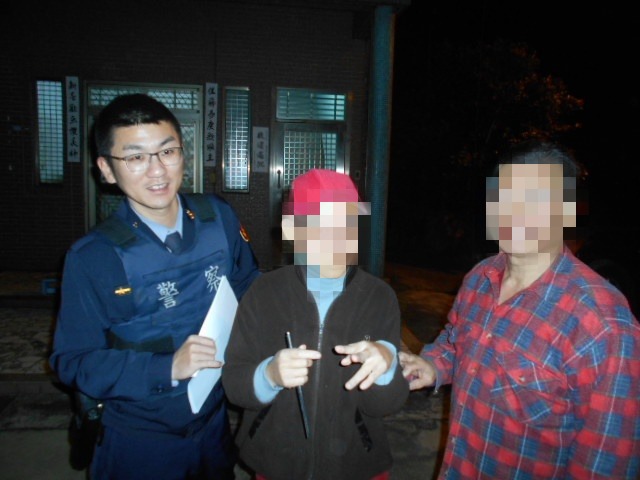 直到晚間10點多,南竹派出所巡邏員警黃大倫在蘆竹區蘆興街巷口見1名男子獨自蹲坐在路邊,自言自語,便向前查看,認出該男子就是前幾個小時在派出所被通報失蹤之姜男,隨即護送回派出所並馬上通知家屬。姜男父親見到寶貝兒子平安無事,頻頻感謝員警的積極熱心幫忙,能在走失後幾個小時內迅速找到姜男,免於在寒風中挨餓受凍。