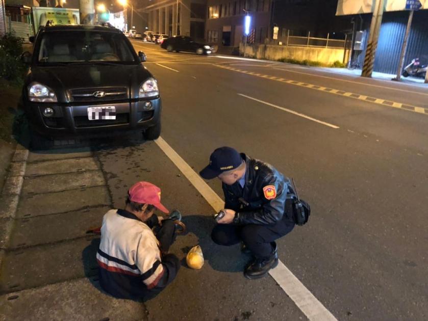 一名居住在桃園市龍潭地區81歲的古姓老翁,在28日天氣濕冷的晚間,被民眾發現倒在龍潭區聖亭路旁,龍潭分局聖亭派出所接獲報案後,隨即趕往處理,現場發現一名年邁老翁竟徬徨無助的獨自蹲坐在路旁,經趨前關心老翁情形,只見其搖頭,無法表達身分及住所,疑有年邁失智情形,員警見當下夜晚且天氣寒冷,便只能開著巡邏車將該名老翁載回派出所查證身分,以確保其安全。