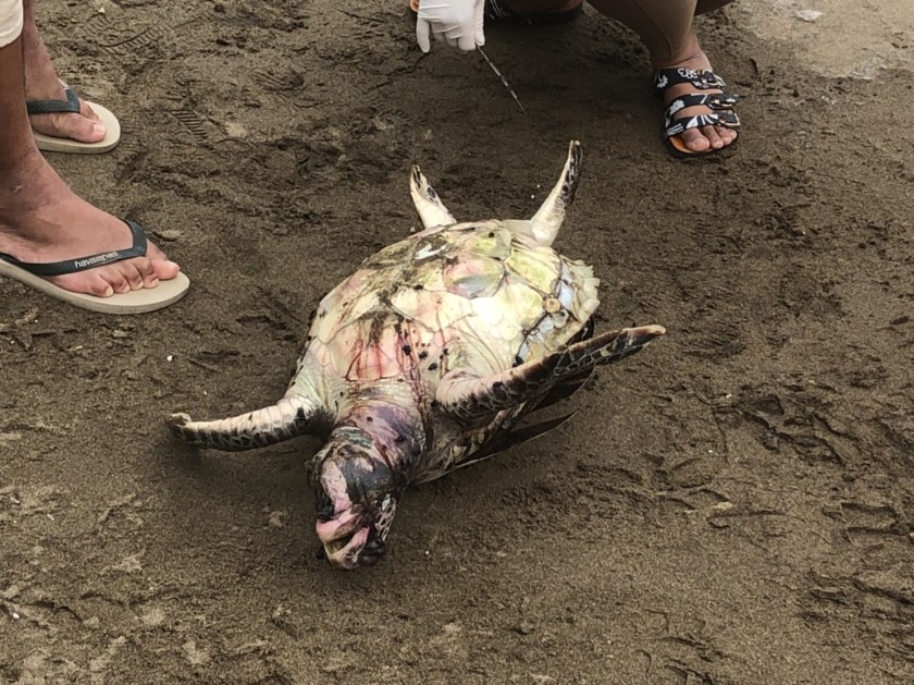 麟山鼻安檢所小隊長及第一機動巡邏站巡邏組前往現場實施封鎖,抵達現場時海龜已無生命跡象,後續基隆海洋大學研究人員於14日1125時許到場實施丈量,判斷為保育類「綠蠵龜」,長38公分、寬33公分,研究人員從海龜身上提取研究素材,隨後海巡人員將死亡海龜就地掩埋。