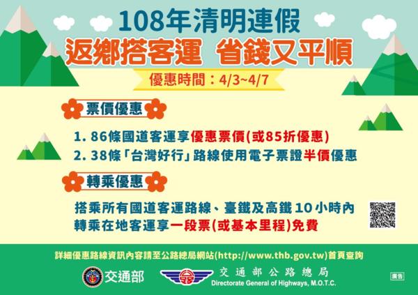 228連續假期結束後,緊接著清明連續假期到來,公路總局自4月3日0時起至4月7日24時止推出各項搭乘客運的優惠措施,只要搭乘交通部核定86條國道客運路線,即可享有全票平均85折優惠票價,例如新竹往臺北(9003路線)優惠票價為110元(定價130元),新竹往臺中(9010路線)優惠票價為130元(定價155元),讓民眾省錢又省力地搭乘公共運具返鄉。