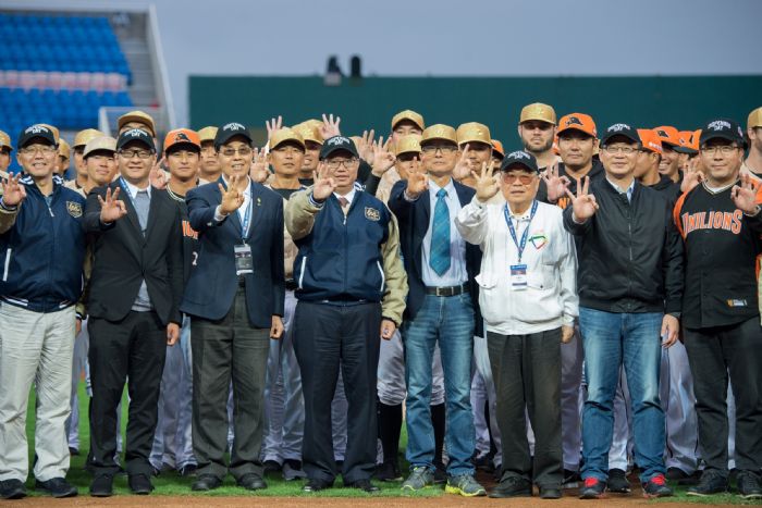 今日包括立法委員陳學聖、市議員徐其萬、涂權吉、教育部體育署副署長王水文、市府副秘書長暨工務局代理局長黃治峯、新聞處長詹賀舜、秘書處長顏子傑、經發局長郭裕信、體育局副局長房瑞文、桃園捷運公司董事長劉坤億、國立體育大學校長邱炳坤、中華職棒大聯盟會長吳志揚、秘書長馮勝賢、創會會長唐盼盼、前秘書長陳俊池、Lamigo桃猿隊董事長劉保佑、總教練洪一中、領隊劉玠廷、統一7-ELEVEN獅隊董事長涂忠正、領隊蘇泰安、香港棒球總會主席范駿華、日本職棒聯盟國際部長中村勝彥、日本職棒規則委員長井野修均一同出席活動。