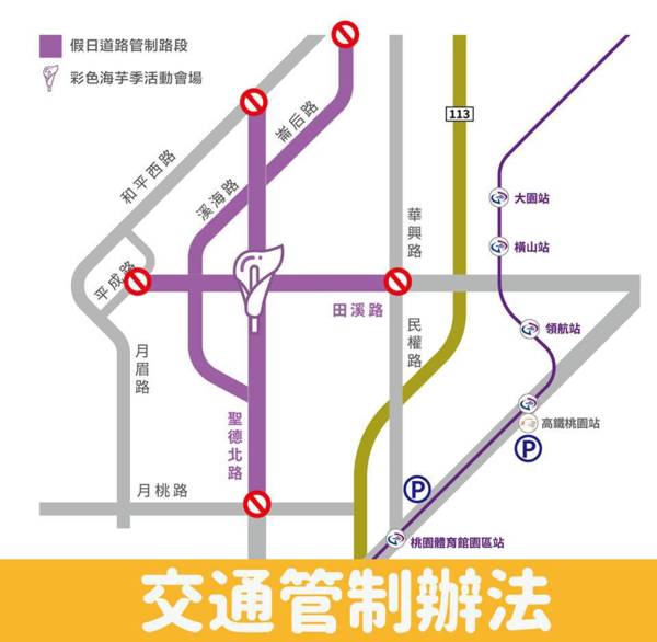 大園警方表示,今年的桃園彩色海芋季展期共18天,橫跨3個週末假日,其中4月4日至7日為清明節連續假期,預估湧入大量人、車潮,為避免造成現場交通壅塞,警方將於例假日及清明節4天連假的上午7點至晚上6點,針對「和平西路與聖德北路口」、「和平西路與崙后路口」、「田溪路與華興路口」、「田溪路與平成路口」、「月桃路與聖德北路口」等5個路口實施交通管制措施,管制期間僅限持有效通行證車輛、接駁專車、救護車通行。