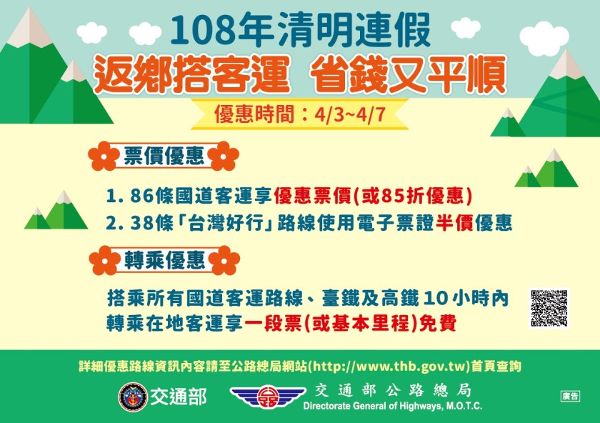 桃園監理站站長林正郎表示本次清明連續假期,交通部公路總局規畫多項公共運輸優惠措施,以方便旅客返鄉過節及出遊,實施優惠日期自108年4月3日凌晨0時起至108年4月7日晚上24時止,搭乘交通部核定86條國道客運路線有全票平均85折優惠票價,請民眾多加利用。