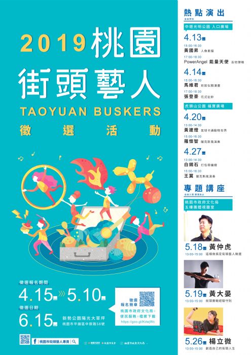 「2019桃園街頭藝人徵選」自4月15日起至5月10日開始受理報名,並將於6月15日(星期六)在平鎮新勢公園公開徵選,包括表演藝術、視覺藝術及創意工藝等三類,年滿16歲之國人或取得中華民國居留證之外國人踴躍報名參加,加入桃園街頭藝人的行列。
