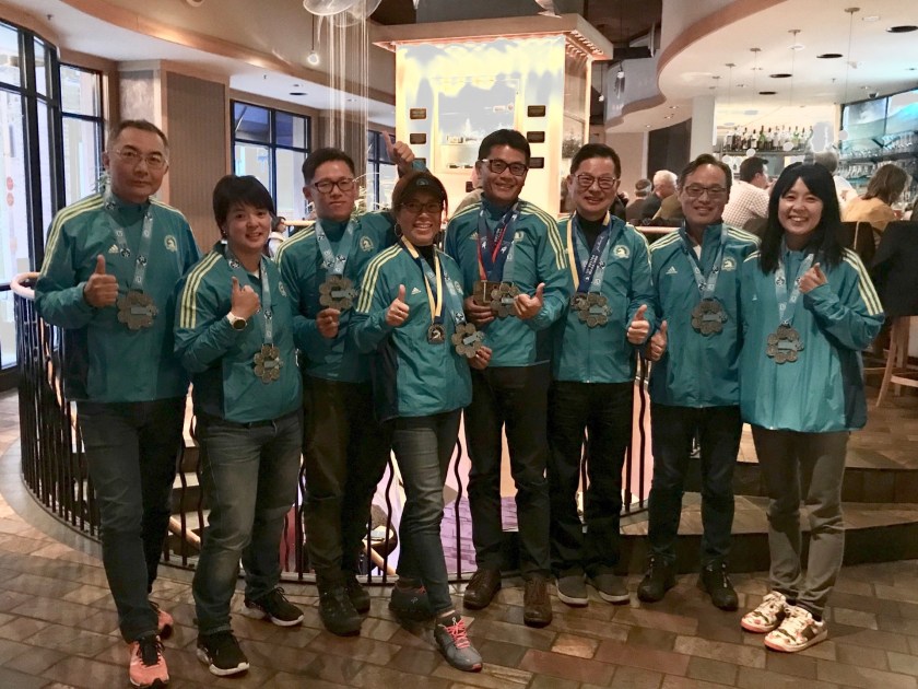 但是,此次,有一個台灣團,包括桃園市體育會馬拉松委員會張紅淇主任委員在內,以及,路跑界有名的舒跑哥詹益榮先生,黃成翰先生,任于祥先生,張政偉先生,邱凱莉小姐,彭桂楨小姐(澎澎姐),姜怡玲小姐,總共就有八位在這次波士頓馬拉松賽完成六大馬而贏得六環獎牌,將於4月18日晚載譽歸國。如果加上其他自行參賽的選手,今年可能會有相當多的台灣跑者可以列名英雄榜!大家努力爭取榮譽為國爭光!