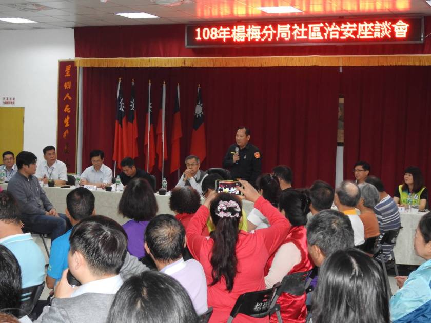 楊梅警分局22日晚間舉辦108年社區治安會議,由楊梅分局分局長林信雄主持,特別邀請永平工商表演藝術科學生帶來川劇變臉演出,會議與會來賓包括立法委員吳志揚、陳賴素美、市議員涂權吉、周玉琴、楊梅區區長羅國裕、桃園市政府警察局副局長林漢堂、刑警大隊副大隊長鄧中義、交通大隊副大隊長蕭貴賓、防治科長王鉉仁及預防科長洪志朋及各里里長、社區守望相助隊隊長、鄰長以及鄉親約120餘人參加,鄉親發言相當踴躍,希望改善治安、交通等問題,分局長在會中也一一作答覆與回映,深獲與會鄉親好評,場面非常熱鬧。