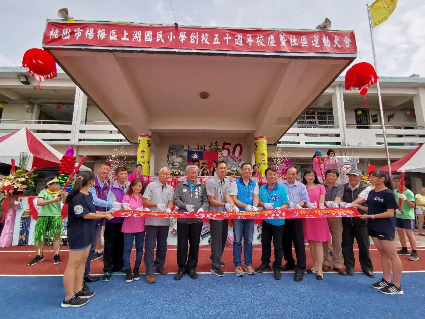 最後,於4月27日(星期六)『五十週年校慶暨社區聯合運動大會』,進入慶祝活動高潮,由楊梅丰太鼓及震溪龍獅集團震撼開場,現場嘉賓冠蓋雲集,桃園市政府教育局高安邦局長特地到場勉勵說道:「上湖國小已經創校50週年了,是桃園市七所客語能力認證示範學校之一,為客家文化的傳承一直孜孜不懈! 在莊錦欣校長及歷任校長認真辦學之下,近年來在教師創新教學以及學生的表現上都十分亮眼。