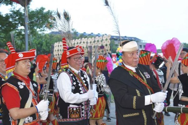 桃園市長鄭文燦27日晚間前往中壢區龍岡大操場,出席「2019龍岡米干節」狂歡節‧目腦縱歌時表示,「2019龍岡米干節」系列活動為期三週,首週為「潑水節」,第二週是「火把節」,最後一週則由今(108)年首次登場的「目腦縱歌狂歡節」和「雲南普洱茶席體驗」為壓軸活動,他也特別戴帽佩刀、身穿雲南少數民族服飾,和現場民眾一同向太陽神祈福、共舞狂歡,體驗雲南人的熱情、虔誠和團結,感受滇緬文化的魅力,帶回滿滿的感動和回憶。