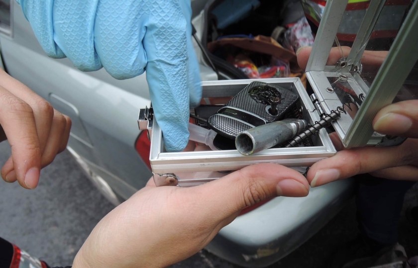 便立即上銬逮捕,隨即呼叫警力到場支援,附帶搜索下在其車內找獲掌心雷手槍1把、子彈2發及大麻。連一旁的莊姓車禍當事人見狀直呼命大,好在警方及時到場並保護他生命財產安全。